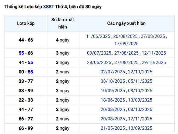 Dưới đây là những đánh giá quan trong cho bảng thống kê lô kép XSST trong 30 ngày gần nhất, nổi bật gồm: